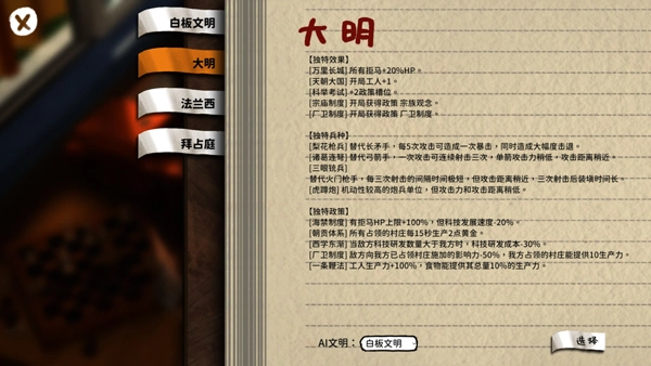 3、随后进行文明的选择,目前可供选择的文明有白板文明、大明、法兰西、拜占庭这四种。