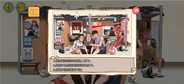 2. 把潘周聃书桌右侧的“老坛酸菜泡面”拖到左侧饮水机那里接水,这时中间的男生就会去吃泡面。
