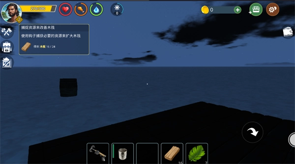 按照屏幕上的说明进行操作:捕捉资源来改善木筏使用钩子捕获必要的资源来扩大木筏,通过瞄准物品去点击抛出收回获取物品来进行制作需要的工具进行生存。