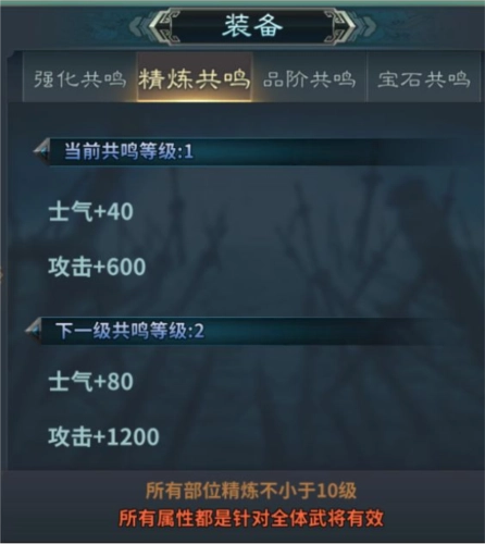 2、精炼:可以使用金油来精炼装备,精炼石可以通过一夫当关、商店购买、充值礼包、寻宝充值商店等途径获取,全部精炼每提升5级可以获得一个共鸣等级,精炼共鸣属性是增加士气以及攻击,随着共鸣等级提升。