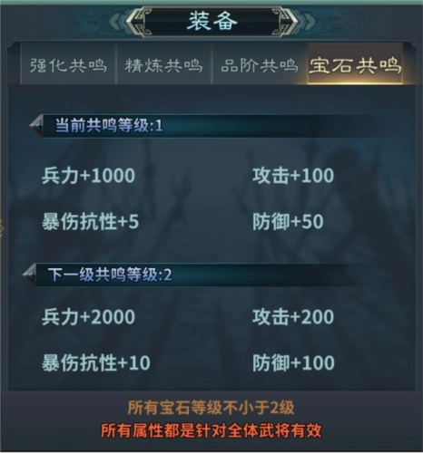 3、宝石:每个部位能够镶嵌三个宝石,每个装备位置镶嵌的宝石也有所不同,可以通过一夫当关、商店购买、购买宝石礼包等途径获取,每个装备部位的三个宝石提升到一样的等级即可提升一个共鸣等级,宝石共鸣属性是增加兵力、攻击、爆伤抗性、防御。