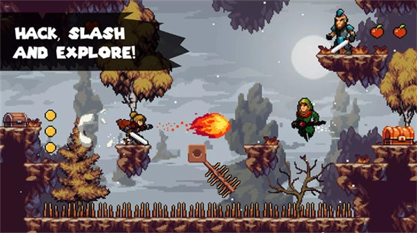 《苹果骑士》中文版采用经典的2D像素画风,画面给人一种舒适的视觉感受。玩家将穿梭于森林、山脉、城堡等形形色色的场景之中,在关卡场景里与各类敌人展开挑战,凭借丰富多样的武器与技能投入战斗,目标是最终成功解救公主。