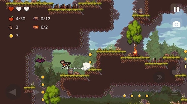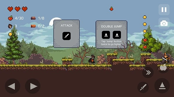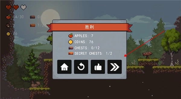 2、按下右下角的向上键即可跳跃,连续按两下能跳得更高。收集到的苹果与金币会显示在左上角,只有收集齐全所有物品,才能完美通关。