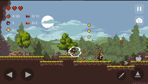 1. 轻点右下角的苹果图标,就能扔出苹果对敌人发起攻击;点击小剑图标,挥动剑可将箱子击碎,进而收集金币与道具,同时也能用剑攻击敌人。