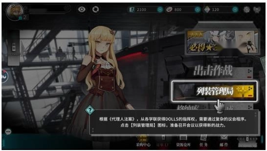 1. 登录游戏,完成新手引导步骤后,于主界面选取[列装管理局]。[列装管理局]是各位代理人获取新DOLLS的关键渠道,耗费一定数量的物资,便可得到列装。