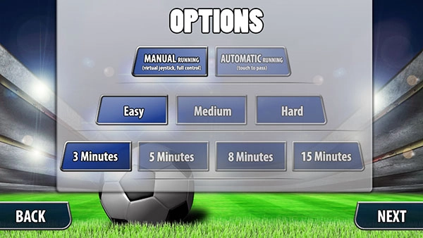 3、选定球队后,进入“options”选择界面,在此界面可选择游戏自动或手动奔跑模式、游戏难度以及时长。