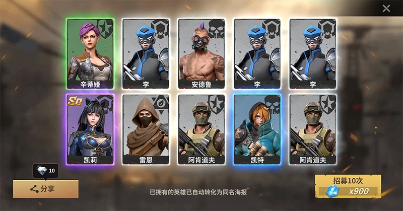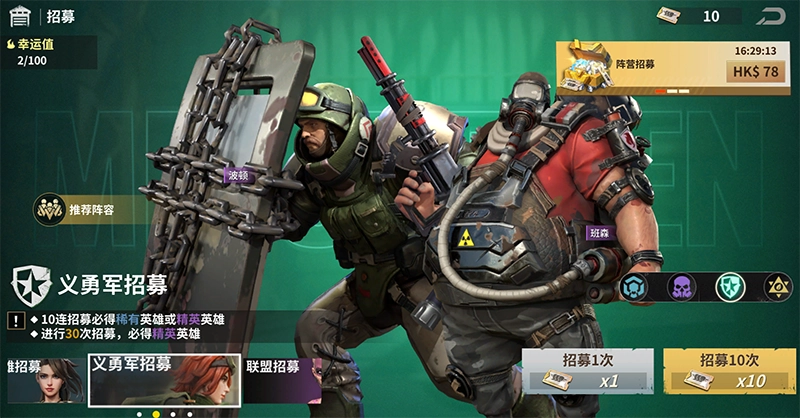 轻点【招募】,就能随机招募到英雄。已成功招募的英雄,会自动转化为同名海报,这些海报可用于英雄进阶。