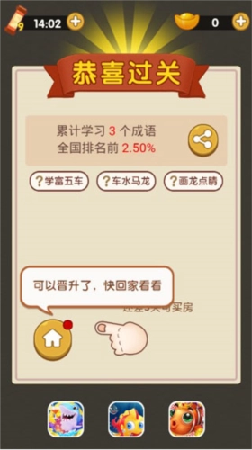 10、快来挑战多样玩法,猜成语、成语填词、成语接龙、填词闯关,还有参加科举,等你一展身手。