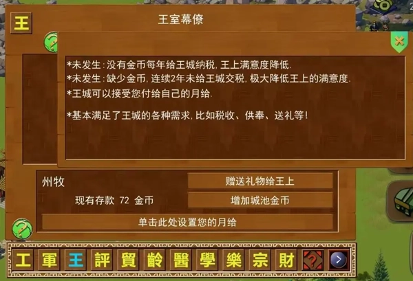 在“王室幕僚”中,点击左上角的“?”号,即可查看影响当前王上满意度的各类因素。