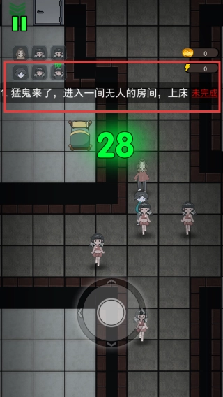 2、游戏过程里,当收到“猛鬼来了”的任务提示时,操控角色进入一间无人的房间,然后上床,以此躲避猛鬼,完成任务。