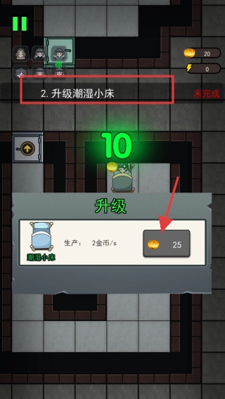 3、于游戏里,依据任务提示来升级潮湿小床。点击箭头所指的金币按钮,耗费25金币就能把潮湿小床升级,进而提高金币生产速度,完成该任务。