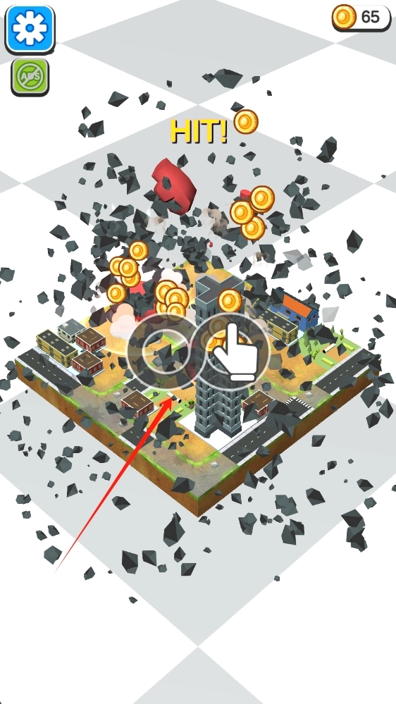 2. 进行界面破坏操作,点击屏幕即可触发建筑破坏效果,在建筑破坏过程中收集金币,以此积累游戏资源,还能通过滑动来破坏建筑。