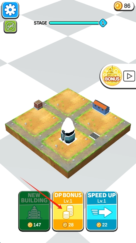 3、进入建设界面,消耗金币对DP - BONUS等进行升级,同时着手建造新的建筑,以此推动游戏阶段的进展,进而解锁全新内容。