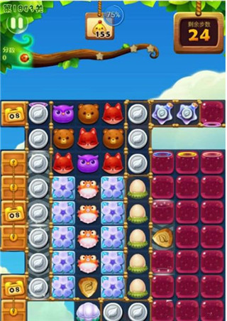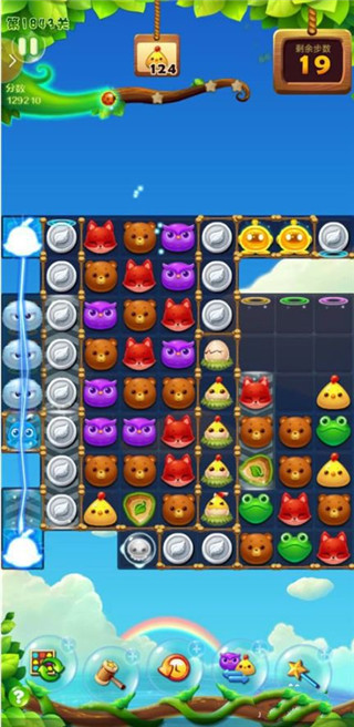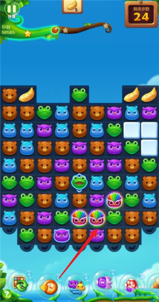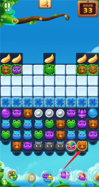 将四种动物组合成发光动物头,当魔力鸟出现时,让它与发光动物一同引爆,这样就能消除上方的众多冰块。