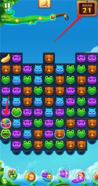 仅剩21步啦,眼下仅有一个豆荚尚未掉落,把魔力鸟消除掉。