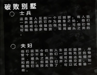 5、破败别墅(Ruined Villa):剧情一为逃兵相关。此地被四个逃兵占据,他们将原主人囚禁于地下室,致其活活饿死,还向其父母勒索10000赎金,行径恶劣,罪该万死。别墅有一个栅栏,上面有四个锁,前往时带上撬棍很有必要。这里存在一个BUG,若第二天再去取东西会被判定为偷窃,因此去一次就好。去的时候要拿上枪、子弹以及防弹衣,要是有包裹,就把值钱的物品带上。