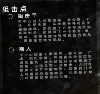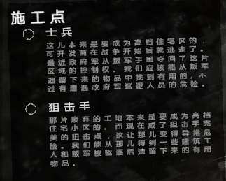 2、施工点(Construction Site):剧情一设定如下,场景中有两个士兵,其中一个手持狙击枪,另一个拿着步枪。首次前往时,地下室无法进入,需待第二次前往时带上锯子。在右边的三楼,有一个上了锁的柜子,里面存放着大量电子元件、药品以及食物,物资颇为丰富。