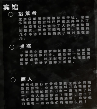 6、宾馆(Hotel):剧情一:土匪出没,表明此地危险。从地图左侧进入,场景中有三个土匪、一名人质,偶尔还会出现一个疯子。区域内有三把锁,进入时需带上撬棍,这里会有大量食物、药品以及众多材料。和别墅一样存在个情况,第二次再来拿东西就会被视为偷窃行为。