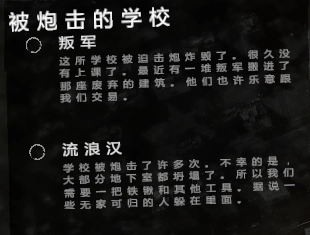3、遭炮击的学校(Shell School):在剧情一中,这里住着无家可归的人。现场有四个土堆,仅一个需要铲掉,且能用手挖开;还有两个栅栏,其中一个必须锯掉。另外有一把锁,无需打开,因为门后并无他物。此地存有大量材料、电子元件与齿轮,还有大量食物。
