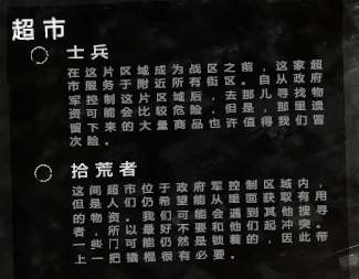 1、超市(Supermarket):剧情一:地图介绍表明此处有危险(Danger),有醉酒大兵正在调戏女孩,别迟疑,带上武器将其解决。配备一把步枪、20发子弹以及酒,就能满足所需。地下室设有两把锁,还有一个土堆,里面材料、食物较为丰富,零件和电子元件的数量也不少。