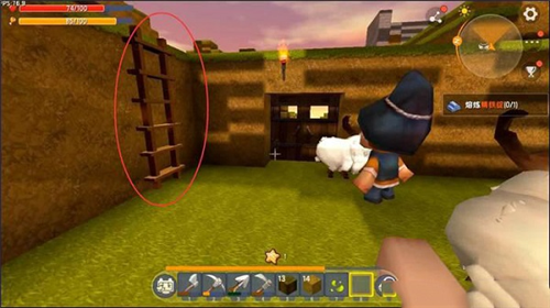 接下来第二步,有两种选择,一是修筑能够开关的门,二是在墙壁上简单挂个梯子。我个人更推荐修筑梯子,原因在于,如果选择门,在吸引新成员进入时必须打开门,这就增大了内部动物逃跑的风险。并且根据我个人的测试,羊无法通过一个四格大的门洞。