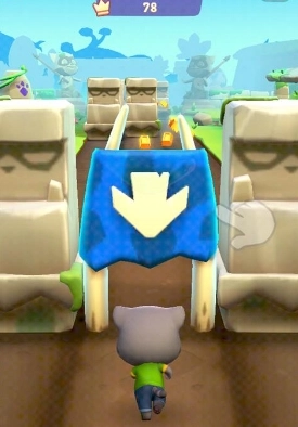 5、向上滑动,此时它会在空中翻滚,接着往左跳,角色便会跳到另一条跑道上。