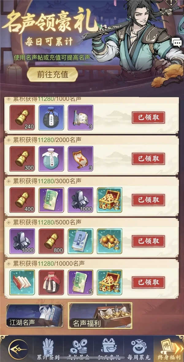 名声福利:在钱庄购买128元的大月卡(即终身卡),待名声达到特定程度,每天都能领取精进点以及武穆遗书。
