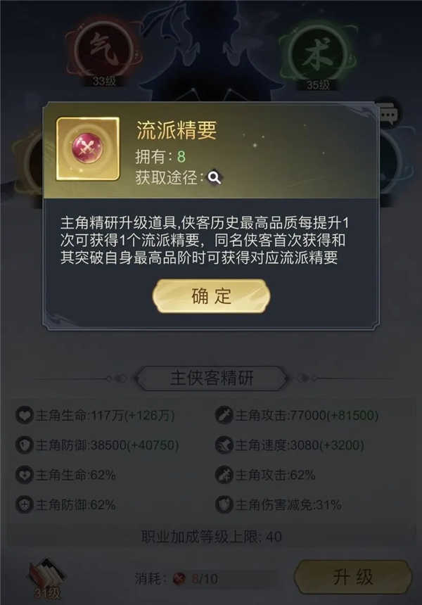 若要提升主侠客的精研等级,就需消耗足够数量的流派精要。【流派精要获取方式】:每次提升侠客品质,便能得到1个流派精要。