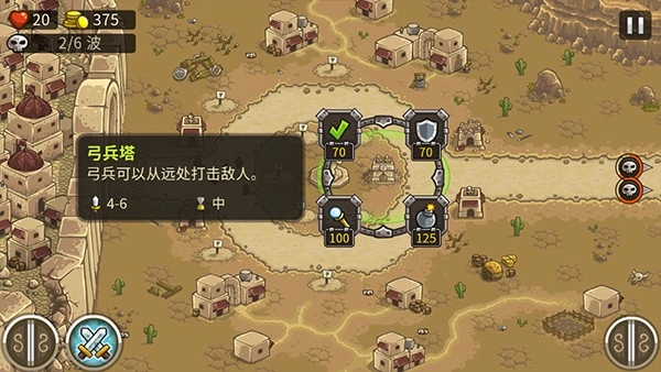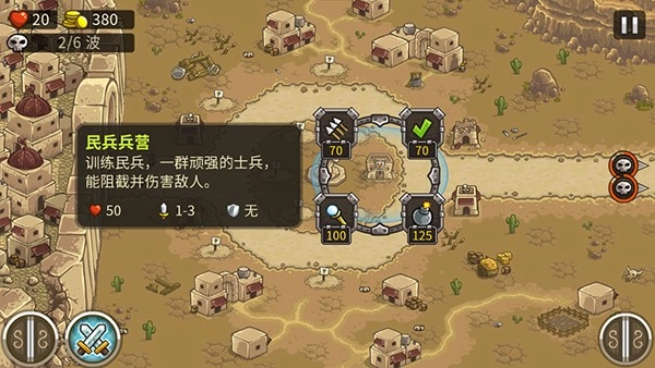 1、建筑:游戏内存在4种基本建筑,分别为箭塔、法师塔、兵营以及火炮塔。每种建筑皆能够进行升级,当升至第四级的时候,会出现转职选项,玩家可在两个选项中择其一。升级成为高级建筑之后,还能够配备2到3种专属技能。