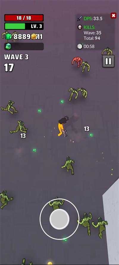 4、拖动下方滑块,即可控制人物移动。当遭遇敌人时,武器会自动开火。仔细留意,击杀敌人后,绿色晶体与金币可供玩家收集,收集到一定数量便能用来购买物品。此外,玩家还能攀爬上灰色石柱,借此获取优势。