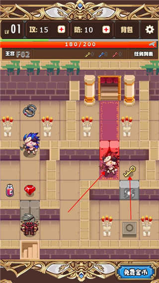 1若想拯救公主,需获取蓝色钥匙以打开大门。首先要击败左边的魔神,方可进入下一层。