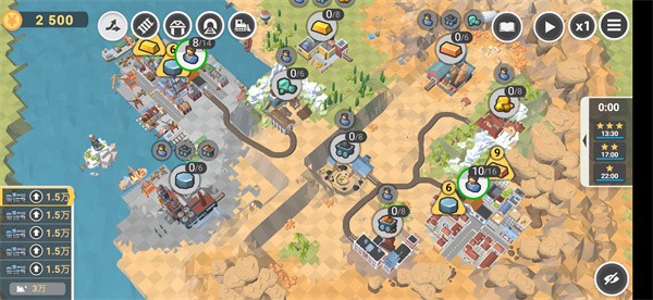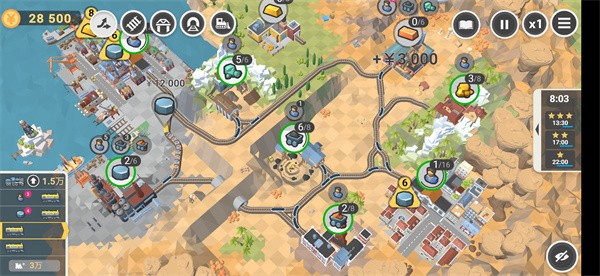 1. 游戏开始,首先将底部的碎石与沙土厂连接起来,并派送人口。接着,把上方的桥与煤场连接,进行煤炭加工。