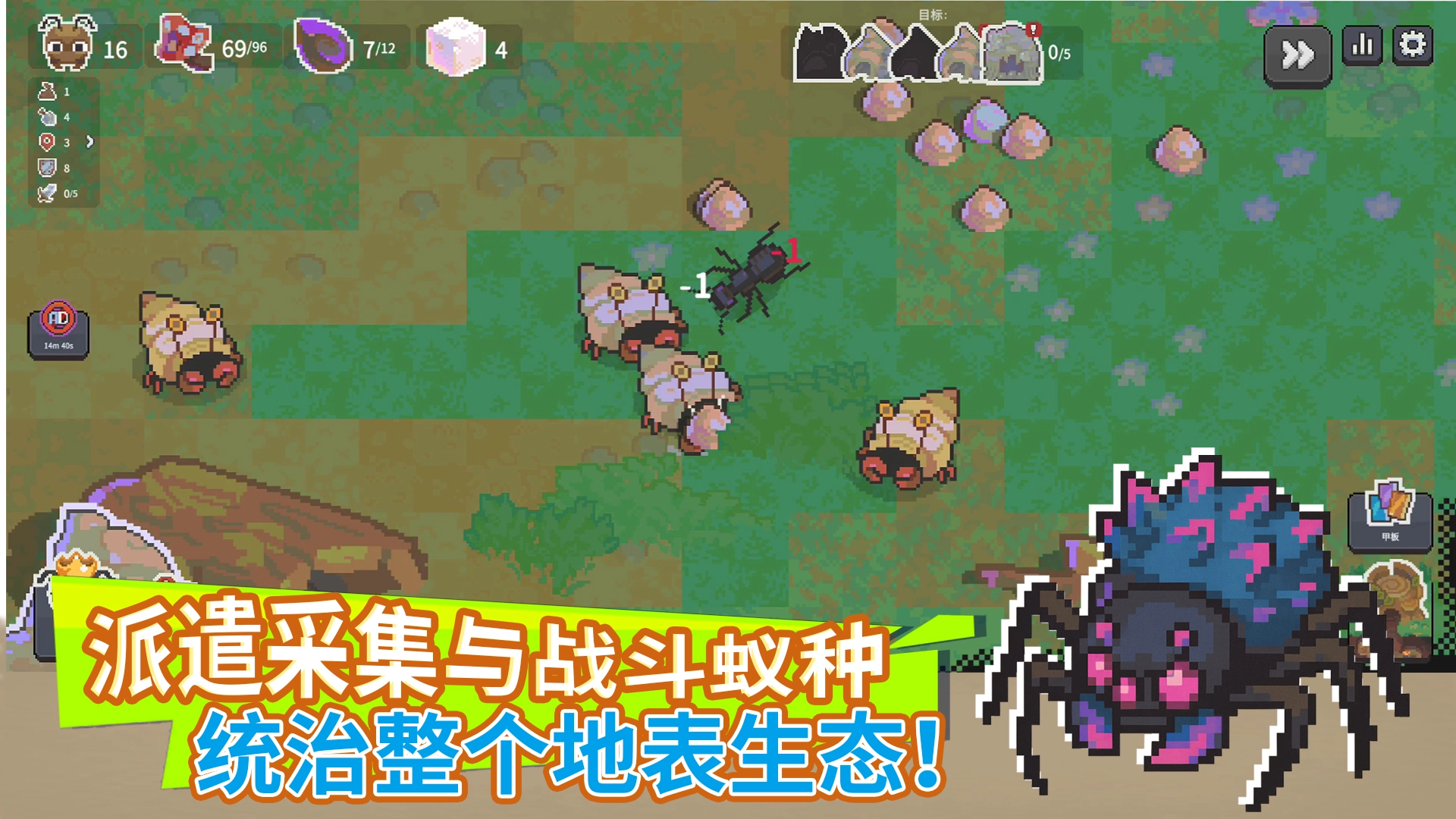 根据需求培育采集蚁、兵蚁等不同蚁种,指挥它们奔赴外界收集资源、开拓领地,以此强化蚁群的根基。