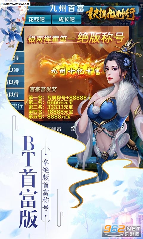 BT首富活动中,尽情挥洒银两,力争榜首可获绝版霸气称号“九州十亿首富”与88888元宝;第二名奖励66666元宝;第三名奖励33333元宝;第四名奖励18888元宝;第五名奖励8888元宝。
