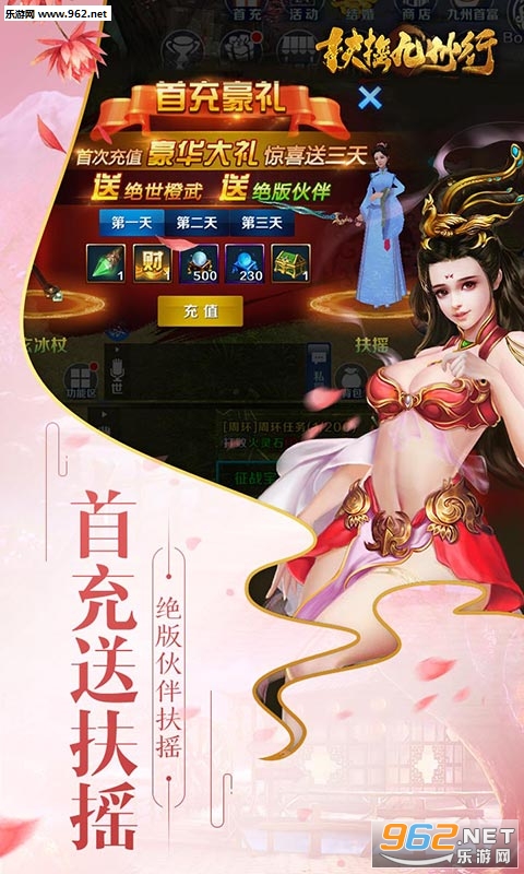 首次充值即可连续领取三天奖励,包含绝版伙伴扶摇、绝世品质的橙武,助力你闯荡九州大陆。