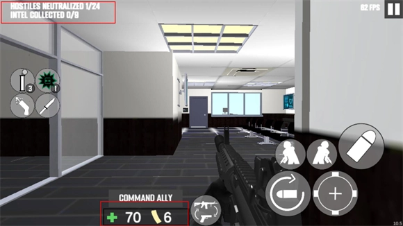 游戏的左上方显示着当前需完成的任务,下方则呈现玩家的生命值与弹药数量。