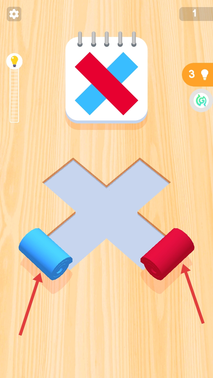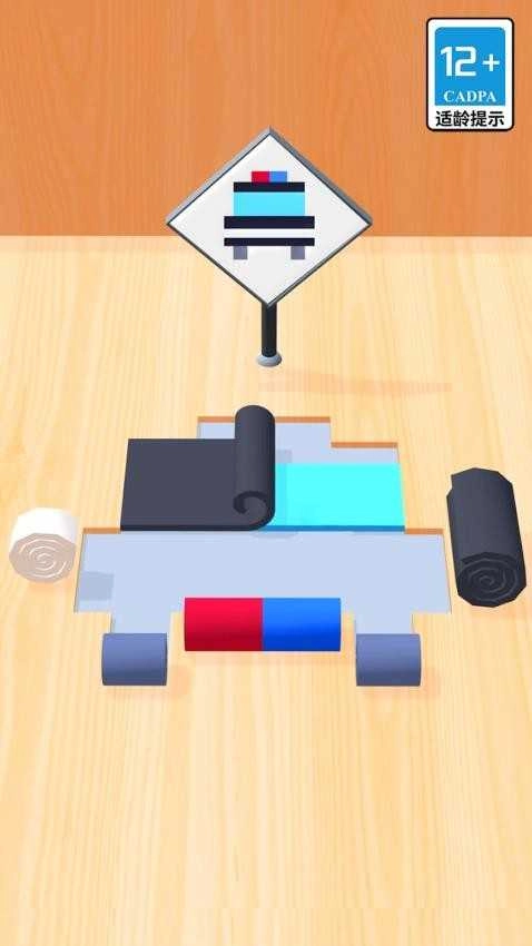 2、在关卡中,观察上方目标图案,通过拖拽下方对应颜色或形状的卷材,将其放置到相应位置。