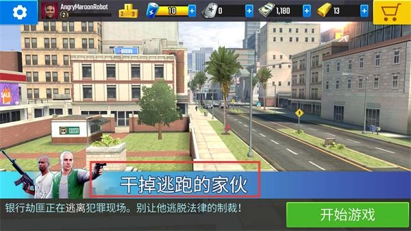 在任务界面找到“干掉逃跑的银行劫匪”这个目标,点击【开始游戏】按钮就能进入这次的狙击关卡了。