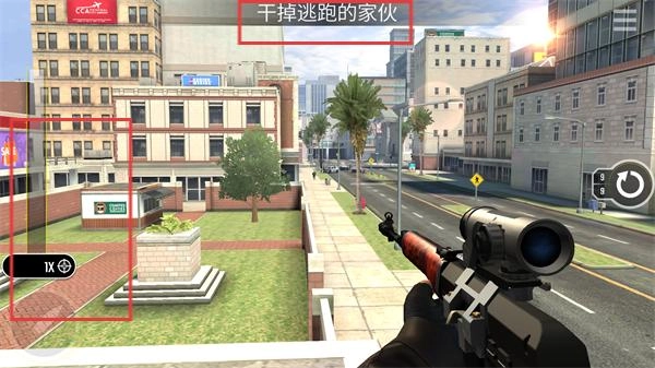 进入关卡后,借助左侧的刻度调节狙击视角,再通过狙击镜锁定街道上正在逃窜的劫匪的位置。