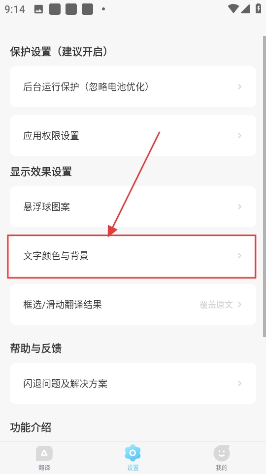 进入设置页面后,点击【文字颜色与背景】选项,就能进入文字颜色和背景的设置界面啦。