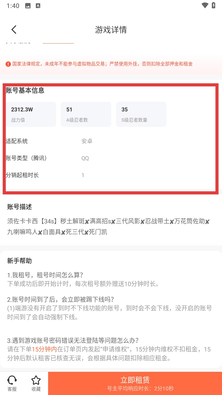 在借号玩平台,进入游戏账号的详情页面后,能够即时查看账号的基础资料,包括适配的系统、账号的类型以及分销时的起租时长等信息。平台会实时更新各类热门游戏的账号资源,客服人员全天在线提供服务,用户可以一键收藏自己感兴趣的游戏账号。需要特别注意的是,严禁使用外挂,一旦发现,将扣除全部押金和已支付的租金。