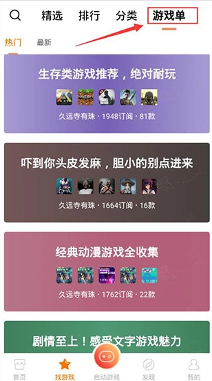 接着点击游戏单进入,里面有生存类、恐怖类、动漫类、文字类等不同分类,你可以依据这些分类来挑选游戏。