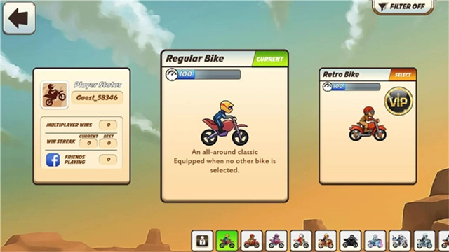 这款游戏的模式属于传统的摩托飞车类型,玩家需要驾驶摩托跨越一道道艰难的赛道,以最快速度冲向终点。