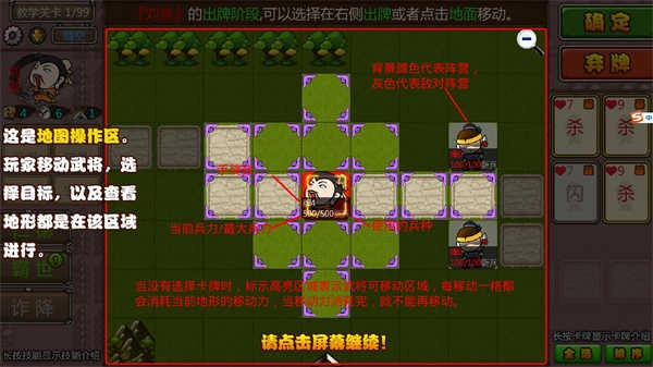 每关都会有多位武将出场,这些武将分成玩家阵营和电脑阵营两个阵营,双方轮流行动。玩家行动阶段开始时,玩家能点击任意一名己方武将执行行动;该武将行动结束后,再依次操作其他还没行动过的己方武将。等所有己方武将都完成行动,点击“结束回合”就会切换到电脑行动阶段。电脑完成行动后,又会回到玩家行动阶段,如此循环交替进行。