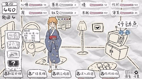 游戏里很多选项都会对善恶值产生显著影响,所以刚开始玩的时候不建议急着刷善恶。玩家得通过玩游戏、参与培训以及摇售货机这些方式,来提升化形、心情、本我、壕、审美和社交等各项属性,最终要把这些属性都提升到八九十点的水平。差不多等个400年左右,再着手调整善恶值,把善恶比例控制在30,废的比例保持在70,这样就能顺顺利利地成仙了。