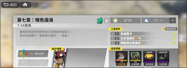 7-14到14关卡的名字是暗色旋涡,它是主线剧情第七章的最后一关,自然,这一关是首领战,敌方首领叫舒莫,是杀害空裔一族的凶手之一,从这一关起,游戏的剧情高潮就拉开了序幕。