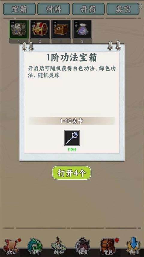 打开各种宝箱获得各种对应的功法、灵珠、道具等等。