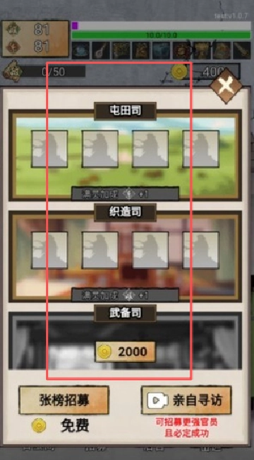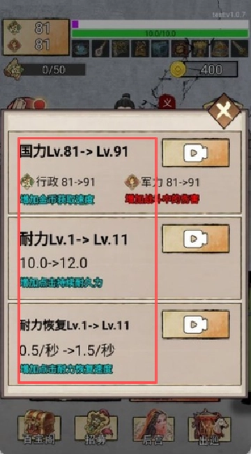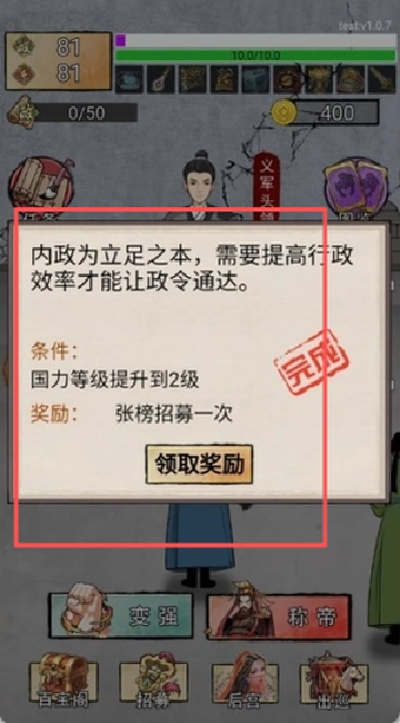 通过完成日常任务和进行资源建设来积累国力,与此同时招募拥有特殊能力的历史人物来辅佐朝政。