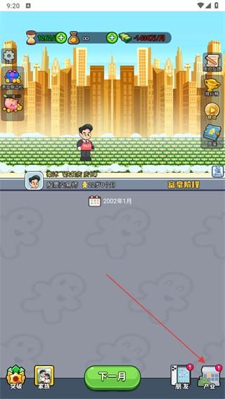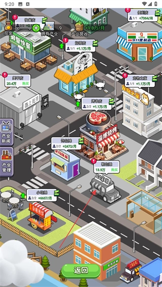 点击界面右下角的产业按钮,即可进入产业管理地图界面,在该界面中,您能够查看所持有的产业(例如快餐店、奶茶店)以及待购买的产业各自的月度营收状况。