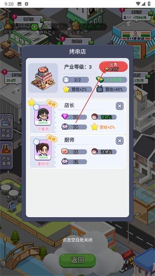 可以选择你已持有的烤串店,查看该店产业等级达到3级时店长、厨师岗位的情况,以及对应的营收加成;如果想要转让,也能点击出售按钮,以8.3万的价格把这个产业转出去。